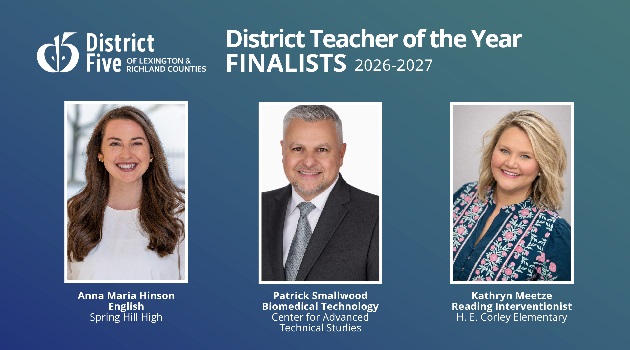 School District Five has named finalists for its 2026-2027 Teacher of the Year award. The finalists are: Anna Maria Hinson, a Spring Hill High School English teacher; Kathryn Meetze, a Reading Interventionist at H. E. Corley Elementary School; and Patrick Smallwood, a Biomedical Technology teacher at the Center for AdvancedContinue Reading